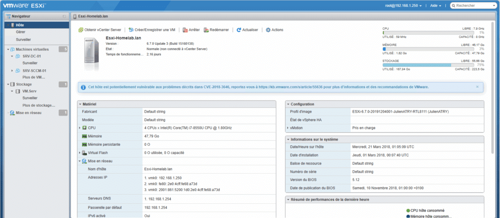 J’ai pu mettre la main sur un ISO de VmWare ESXI 6.5 avec les drivers realtek pour la carte réseau qui n’était pas reconnue dès lors (et qui n’est plus supportée sur les versions ultérieures d’ESXI).